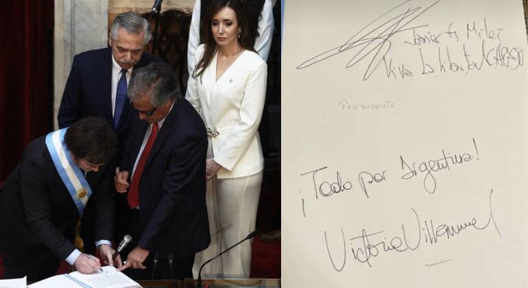 Javier Milei assumiu a Presidência da Argentina neste domingo (10). Como parte do protocolo da cerimônia de posse, o novo presidente e a vice-presidente, Victoria Villarruel, assinaram o livro oficial do Congresso Nacional argentino.