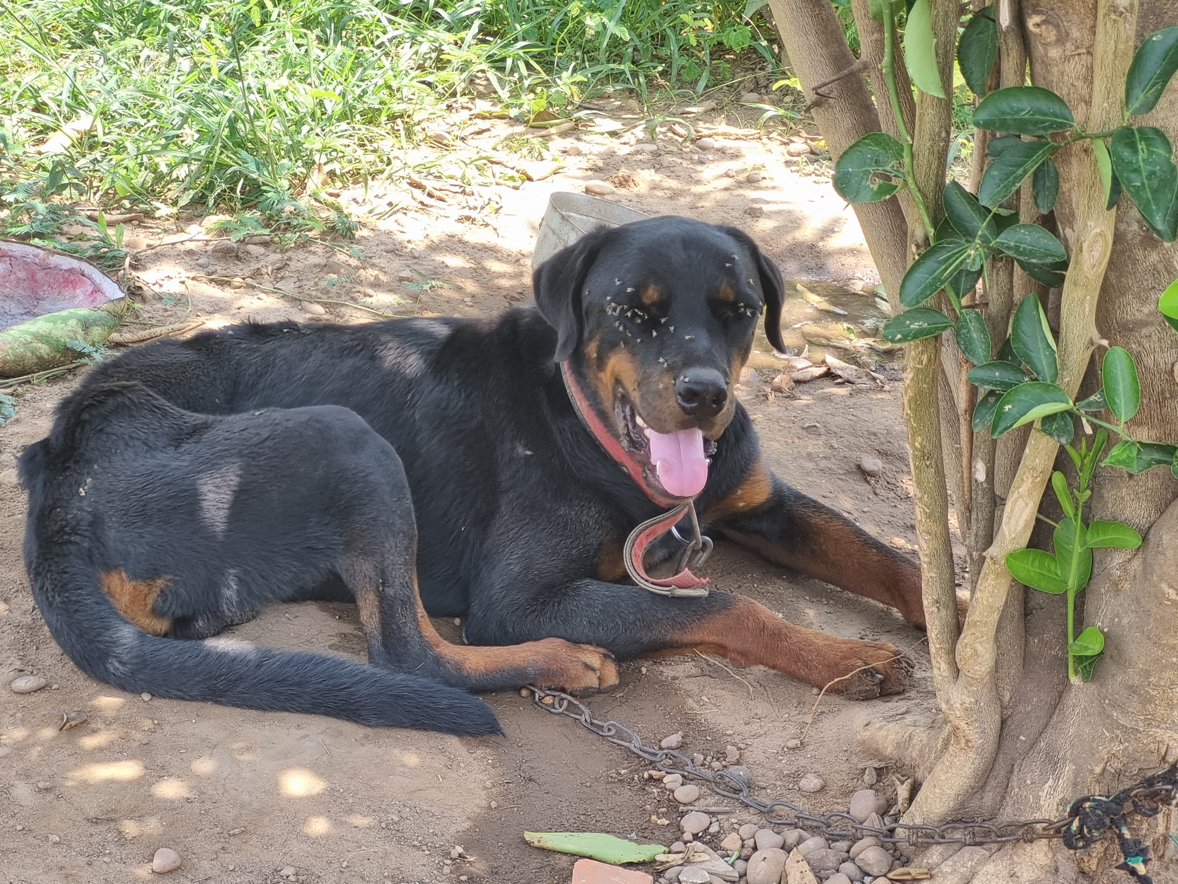 A Polícia Militar (PM) chegou até o local na quinta-feira (26), após receber uma denúncia anônima. A equipe foi até a casa, localizada na rua Bom Jesus, setor Bela Vista, e viu o animal da raça Rottweiler amarrado em um local com pouca sombra e com muitas fezes. Também não havia água nem comida e ele tinha muitas feridas pelo corpo.