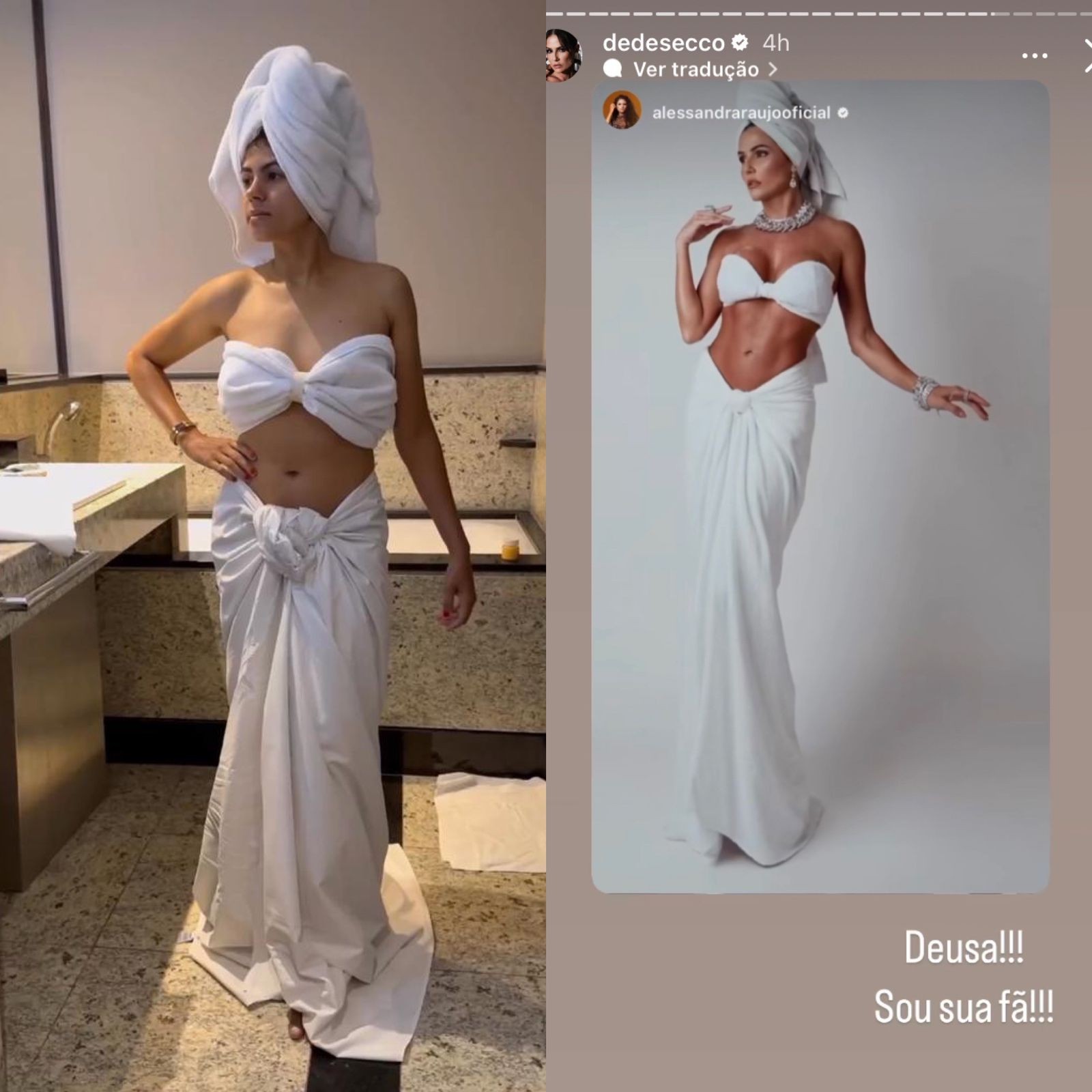 Alessandra Araújo recriou look com toalhas brancas de Deborah Secco