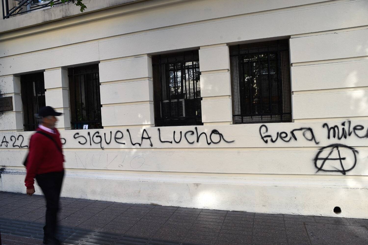 A fachada da embaixada argentina em Santiago foi vandalizada nesta quarta-feira (20), horas antes da primeira manifestação contra Javier Milei convocada em Buenos Aires.
