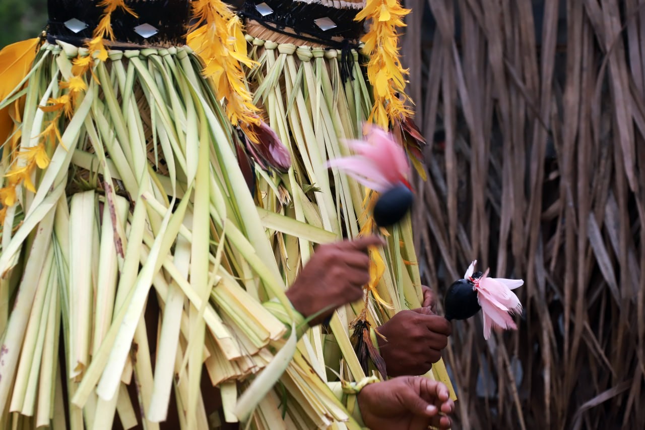 As vestimentas de palha de palmeira cobrindo rosto e corpo se unem aos adereços de cabeça coloridos com penas, que dão o tom de nobreza da cerimônia Hèrèrawo. A festa que tem duração de sete dias marca a passagem para a vida adulta dos meninos indígenas Javaés.