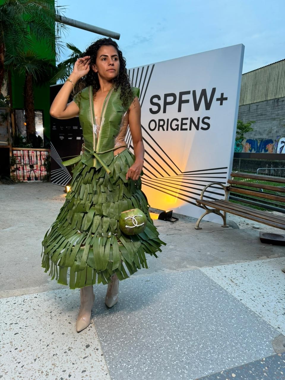 Alessandra Araújo confecciona vestido com folhas de bananeira para ir ao São Paulo Fashion Week