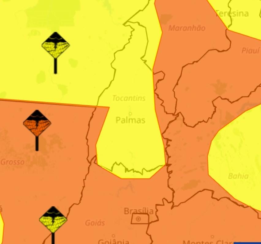 O Instituto Nacional de Meteorologia (Inmet) emitiu dois alertas para o Tocantins, sendo um amarelo, de perigo potencial de chuvas intensas em praticamente todo estado, e o outro laranja, para quatro cidades. Ambos são válidos até 10h desta terça-feira (2).