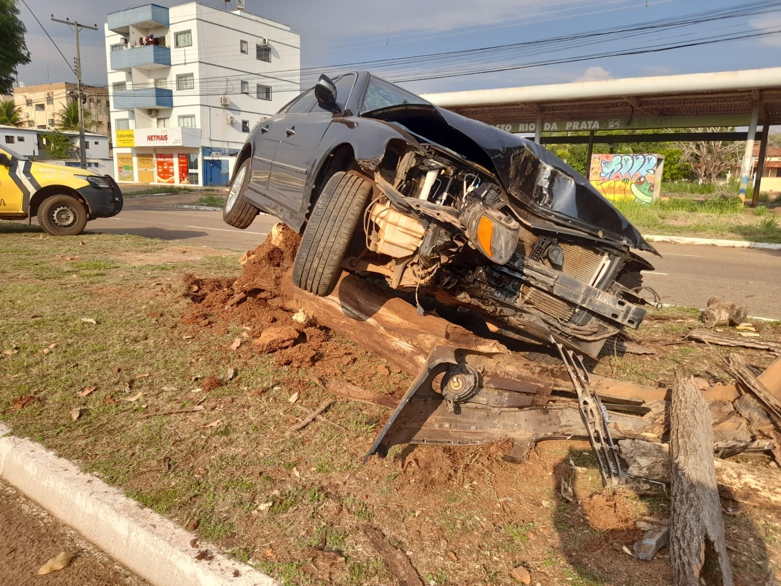 Carro foi parar em cima de tronco de árvore
