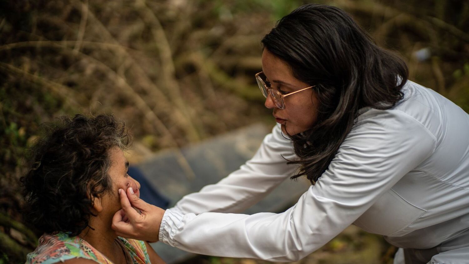 Médica examina paciente que sofreu lesões causadas pela leishmaniose, na Colômbia