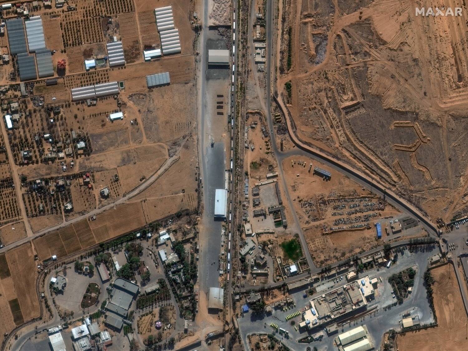 Imagem de satélite mostra caminhões humanitários em fila para entrar na passagem de Rafah