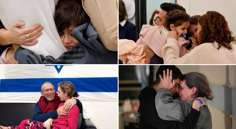 Os últimos quatro dias foram de intensa emoção e alívio para várias famílias de pessoas sequestradas pelo grupo terrorista Hamas em solo israelense em 7 de outubro. Após cerca de 50 dias em cativeiro, mulheres e crianças puderam sorrir novamente ao reencontrar seus entes queridosAvigail Edan, de 4 anos, conversa com os tios, tia Liron e tio Zuli, no Centro Médico Infantil Shneider de Israel. Os pais da menina foram assassinados pelos terroristas na casa da família, no kibutz Kfar Aza, e ela foi levada para GazaAvigail, que também tem cidadania americana, encontrou-se com a avó Shlomit na Base Aérea de Hatzerim, para onde os reféns são levados imediatamente após saírem de Gaza pela fronteira com o EgitoA família Brodetz se reuniu no hospital, após mais de 50 dias afastada. Na foto, o pai, Avihai, abraça o filho Yuval, de 11 anosYuval foi levado pelos terroristas junto com a mãe, Hagar, e dois irmãos, Ofri e OriyaShoshan Haran ao lado de Adi Shoham, de 38 anos, e seu filho Nave Shoham, de 8 anos. Os três foram libertados no sábadoMaayan Zin se reencontra com as duas filhas — Dafna Elyakim (15) e Ela Elyakim (8) — que haviam sido levadas pelos terroristas do Hamas em 7 de outubro. “Depois de um longo período em que vivi numa terrível incerteza, as minhas filhas finalmente estão comigo… As meninas estão retornando a uma situação nova e complexa, e agora temos um período de recuperação que levará tempo”, afirmou a mãeSolta no grupo de sábado, Sharon Hertzman Avigdori, de 52 anos, revê o filho, Omer, após chegar a solo israelenseHila Rotem Shoshani, de 12 anos, abraça um tio no hospital. Ela foi solta sem a mãe, no que Israel considerou um descumprimento do acordo por parte dos terroristas do Hamas. A filha afirmou que as duas estiveram juntas até dois dias antes de ser solta e que a mãe estava em boas condiçõesA menina irlandesa-israelense Emily Hand, de 9 anos, abraça o pai, Thomas, após ser solta, no domingo (26) Logo após o atentado terrorista, Thomas chegou a ser informado por autoridades de que Emily estaria morta. Ele é viúvo — a mulher morreu de câncer há alguns anosA família Asher foi parte do primeiro grupo, solto na sexta-feira (24). A mãe, Doron (34) e as filhas, Raz e Aviv, de 2 e 4 anos, respectivamente, foram levadas por terroristas da casa da família, no kibutz Nir Oz, na manhã de 7 de outubro. O pai, Yoni, não estava na residência no momentoTambém estavam no primeiro grupo a mãe e a filha Danielle Aloni, de 45 anos, e Emilia, de 5 anos. Elas se reencontraram com familiares ainda no hospitalOhad Munder, que completou seu nono aniversário como refém em Gaza, foi uma das crianças libertadas no primeiro dia da trégua. No hospital, ele correu para os braços do pai