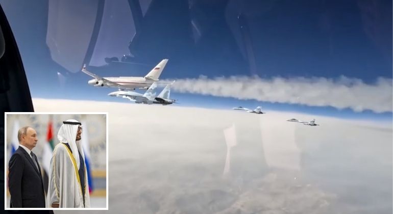 O presidente da Rússia, Vladimir Putin, viajou nesta terça-feira (6) para os Emirados Árabes Unidos escoltado por quatro caças russos, em um trajeto de 3.700 km entre Moscou e Abu Dhabi.
