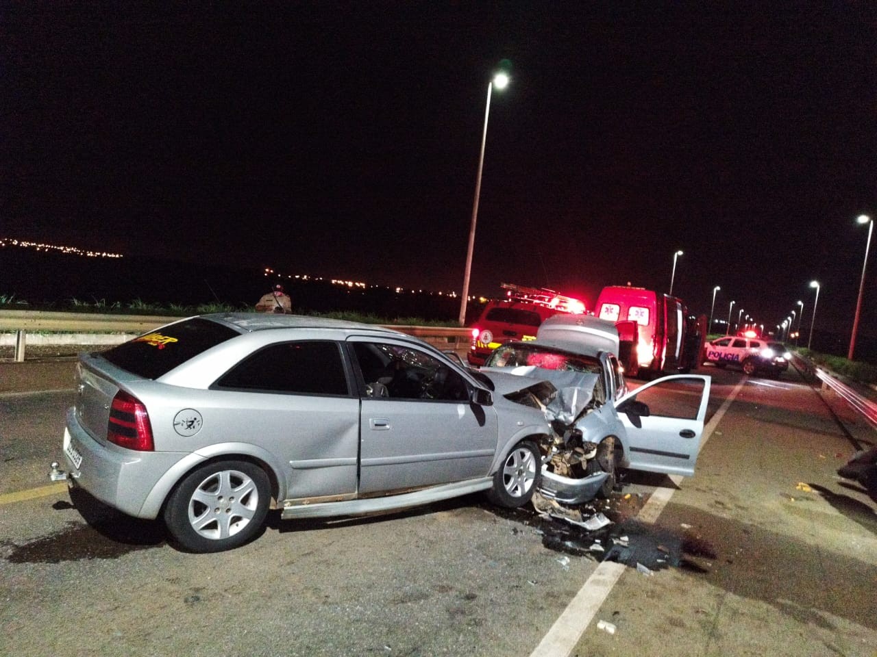 A batida aconteceu por volta das 2h30. As imagens feitas no local mostram que os carros bateram de frente e ficaram bastante danificados. Os bombeiros e o Samu foram chamados para atender os feridos.
