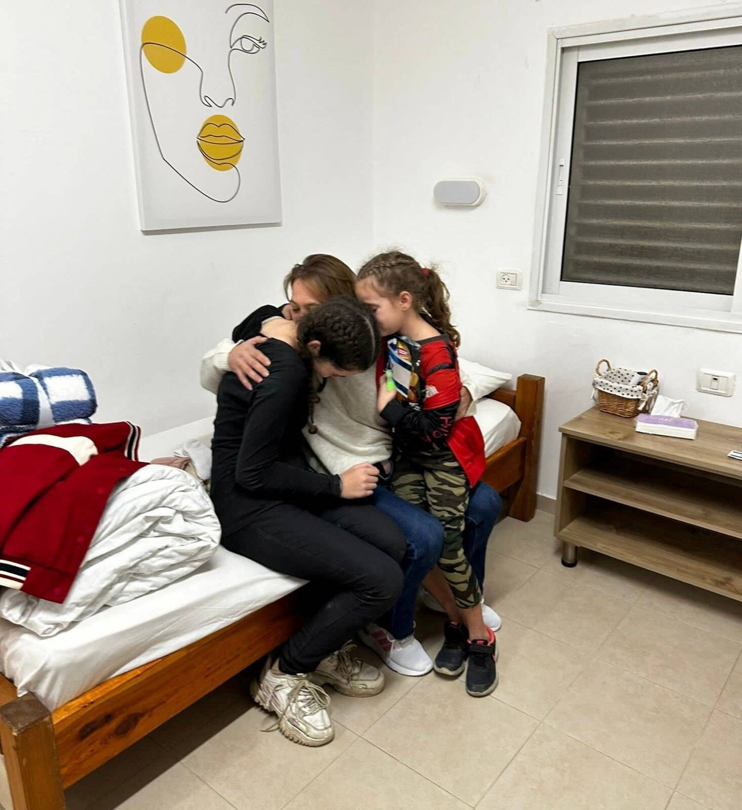 As irmãs Dafna e Ela Elyakim recebem o carinho da família após mais de 50 dias sequestradas